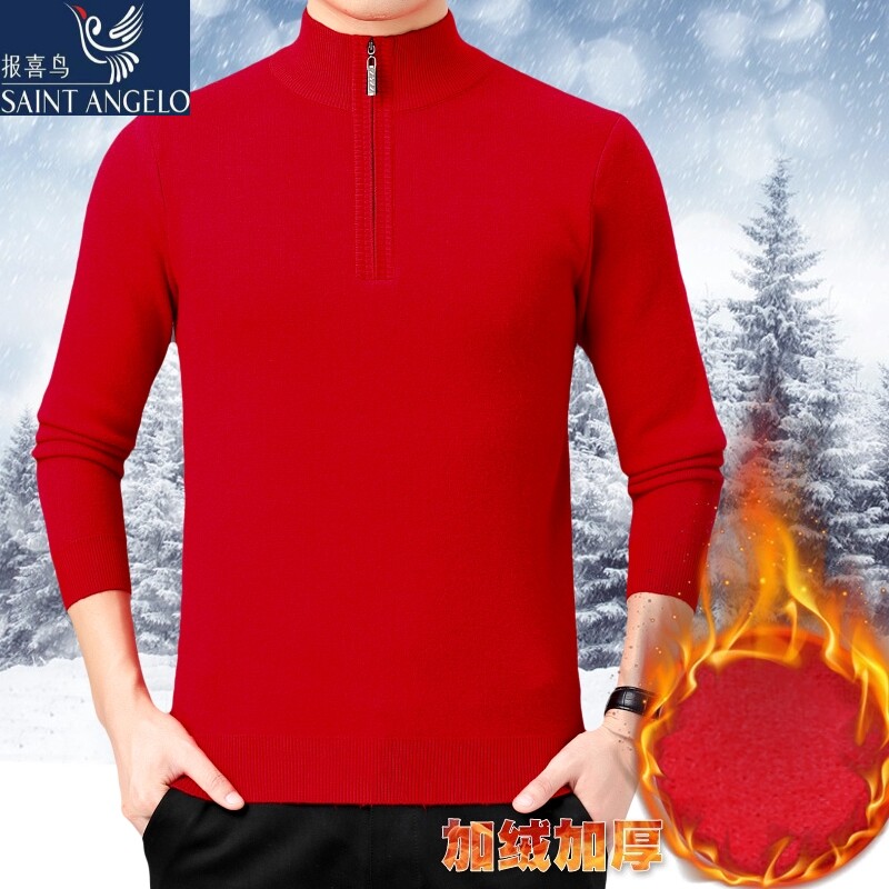 报喜鸟100%山羊绒衫男士冬季加绒加厚针织衫龙年本命年大红色毛衣