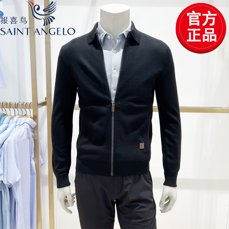 报喜鸟男士针织夹克衫翻领外套黑色百搭商务休闲舒适保暖专柜正品