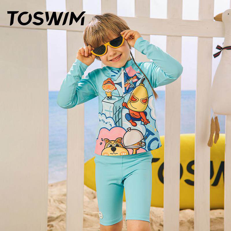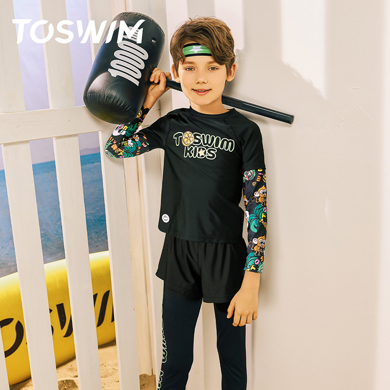 TOSWIM儿童泳衣男童分体长袖保暖男中大童防晒速干泳裤萌趣游泳衣