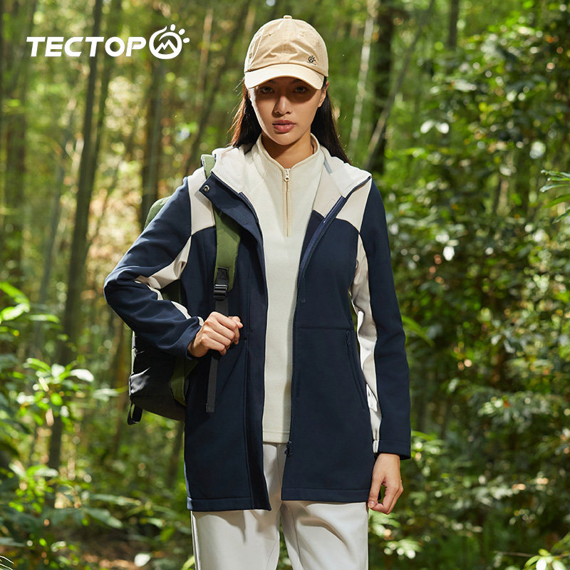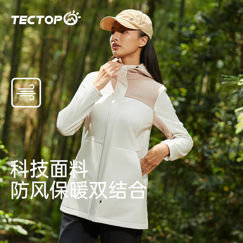 探拓户外抓绒软壳衣女中长款加绒冲锋衣服秋冬季防风防水连帽外套