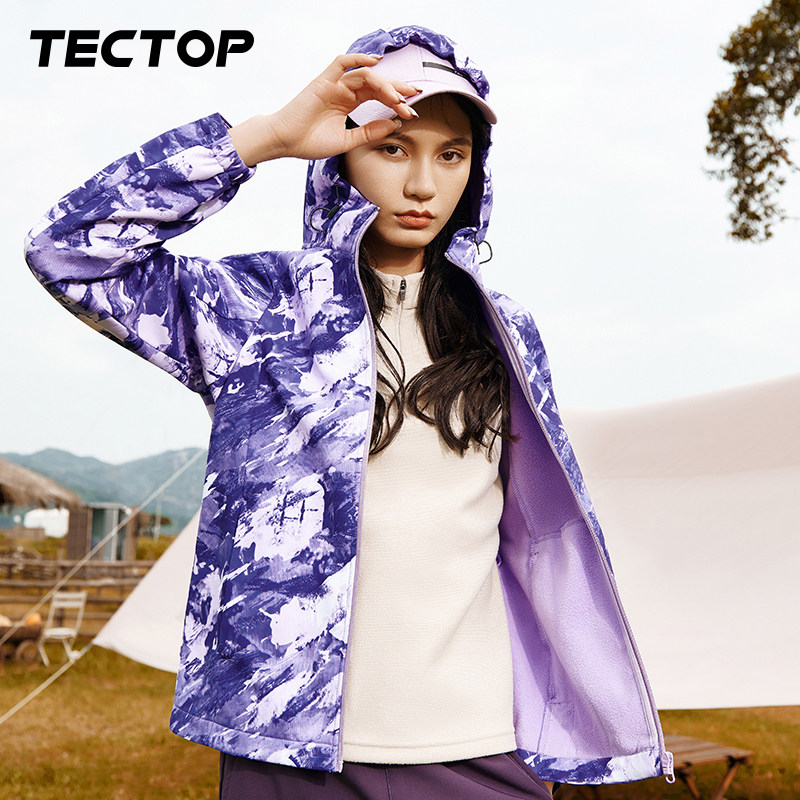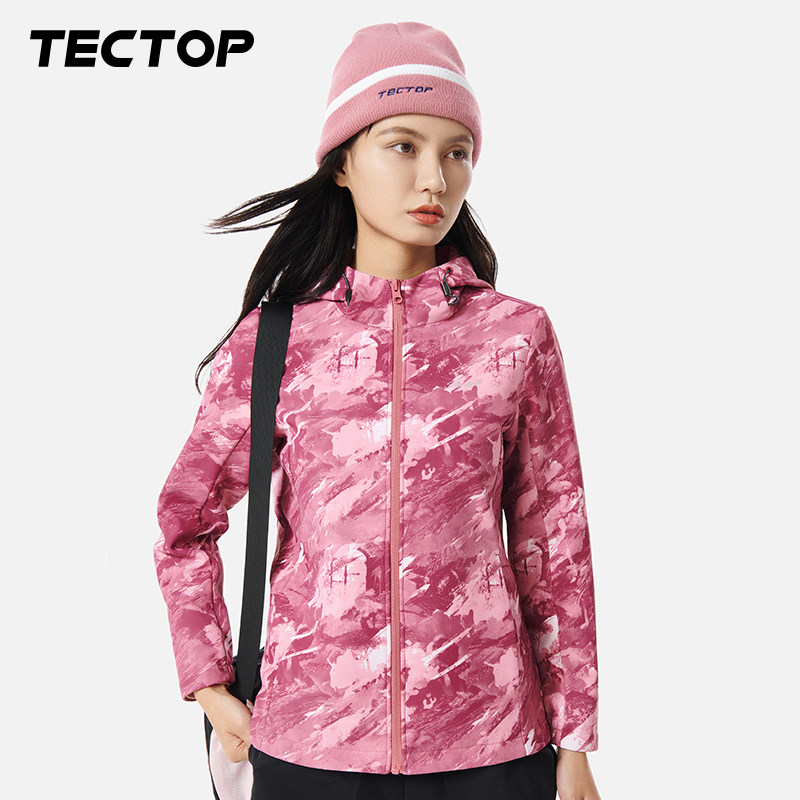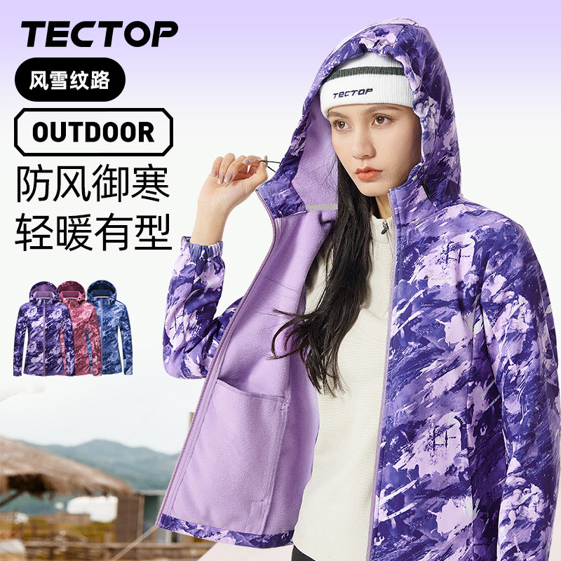 探拓户外运动软壳衣女冬季防风防雨印花连帽冲锋衣骑行摇粒绒外套