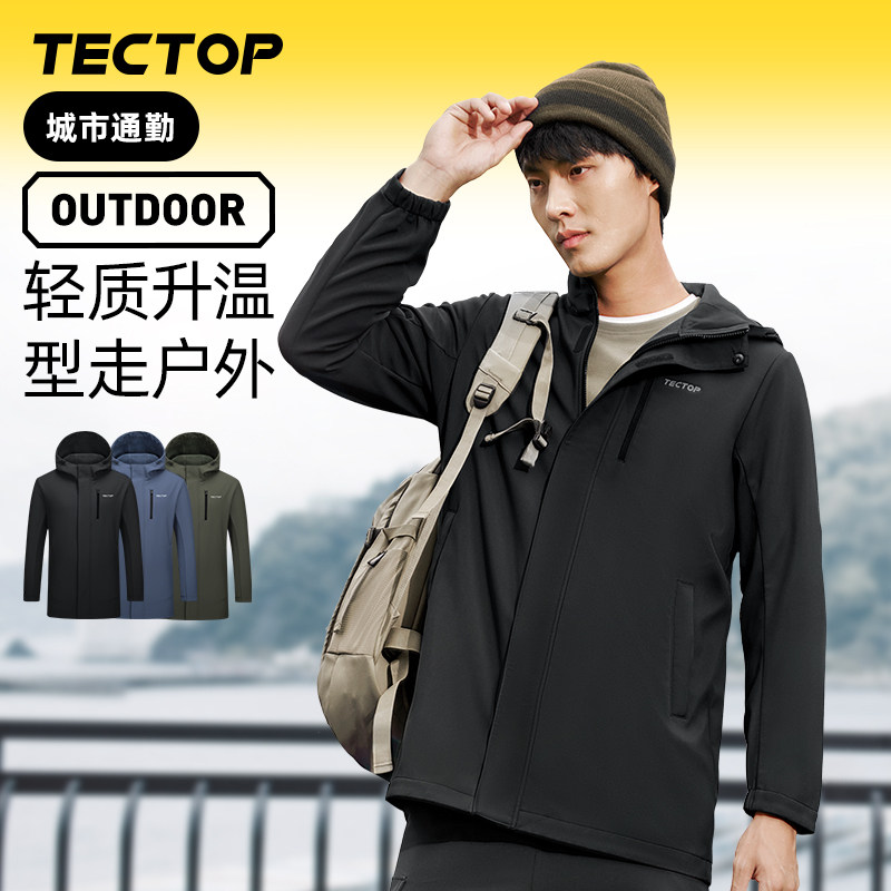 探拓户外运动软壳衣男秋冬季防风防水加绒冲锋衣连帽登山骑行外套