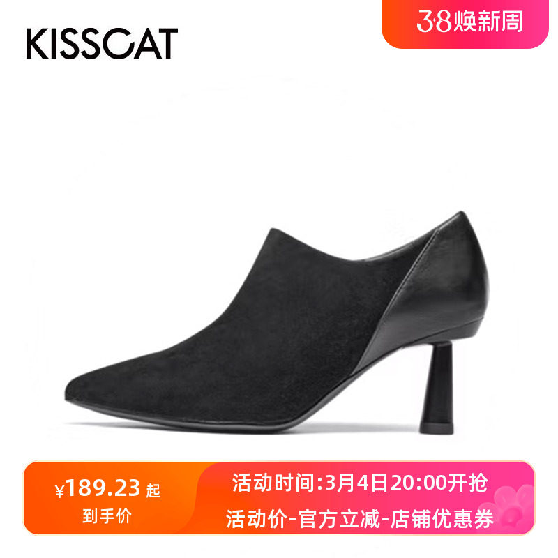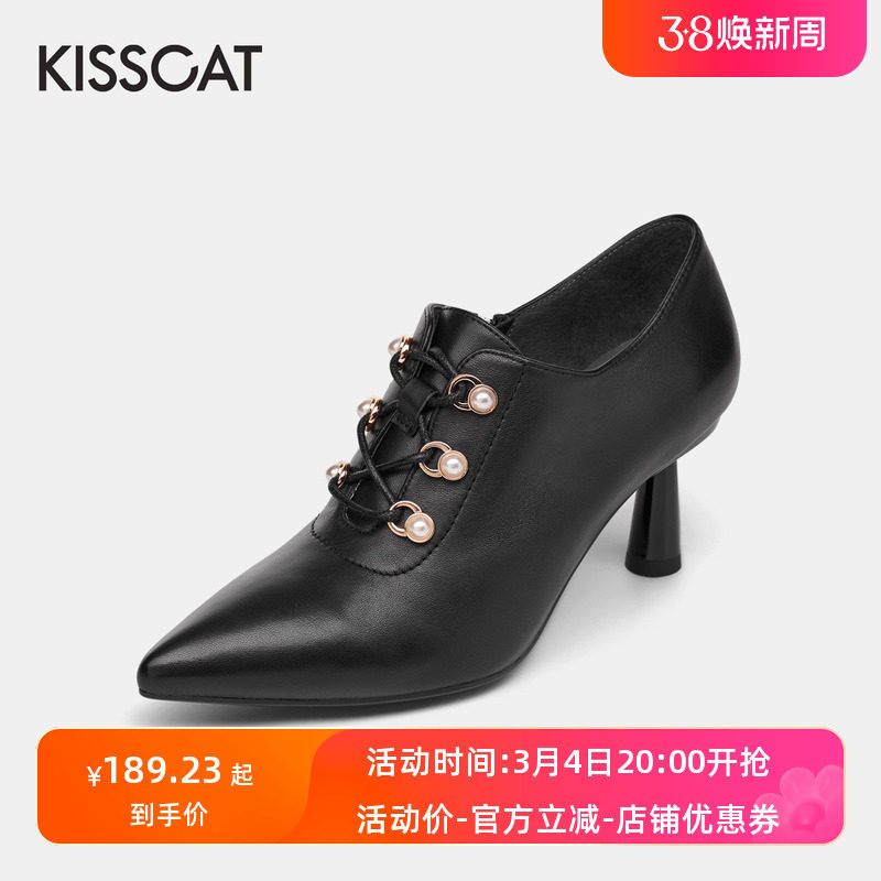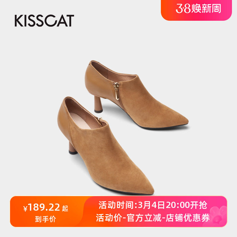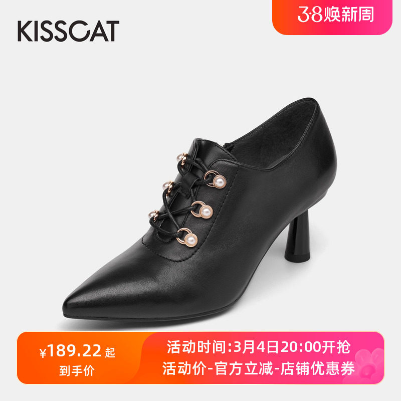 KISSCAT/接吻猫秋冬尖头羊皮踝靴侧拉链系带高跟单鞋女KA21536-10