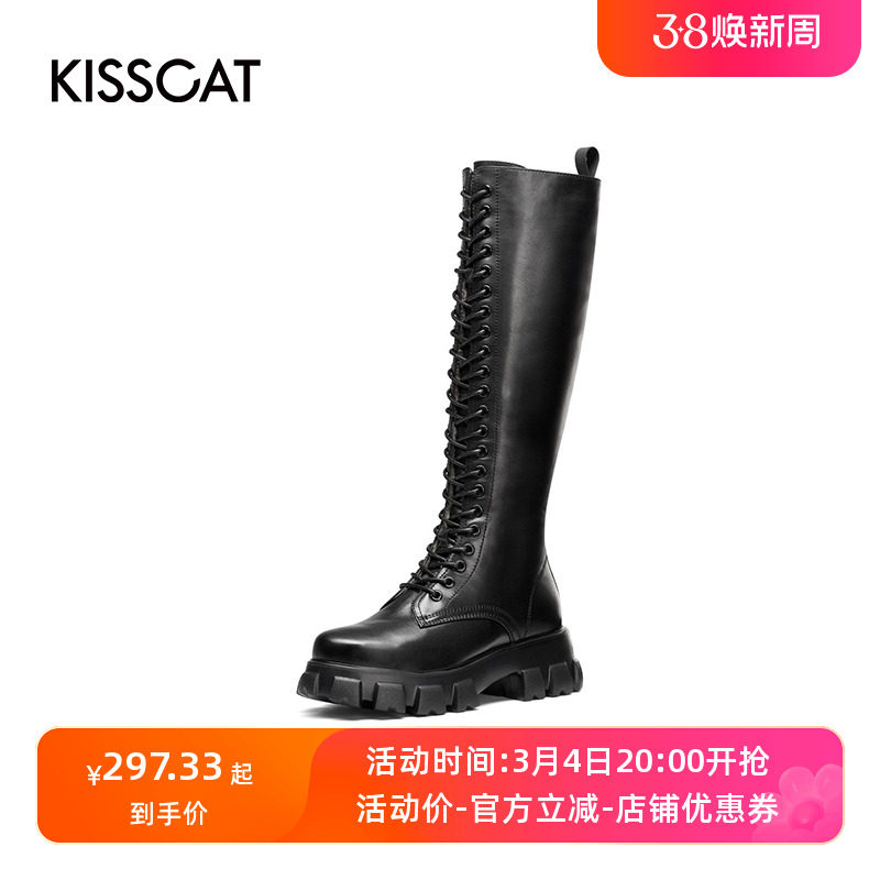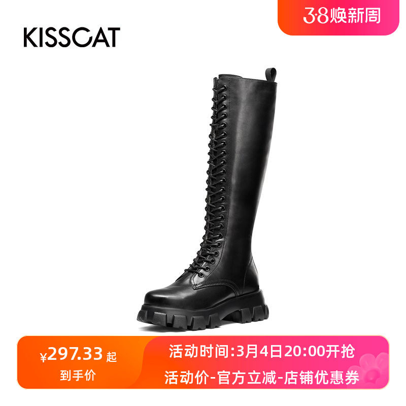 KISSCAT/接吻猫秋冬牛皮系带长筒靴厚底侧拉链时装靴女KA10554-52
