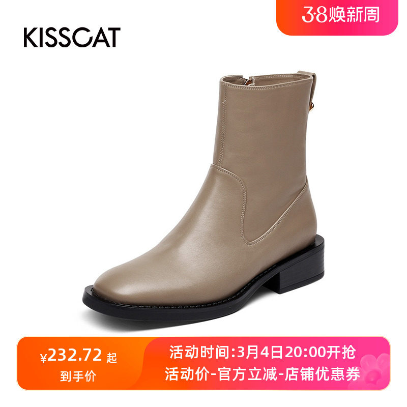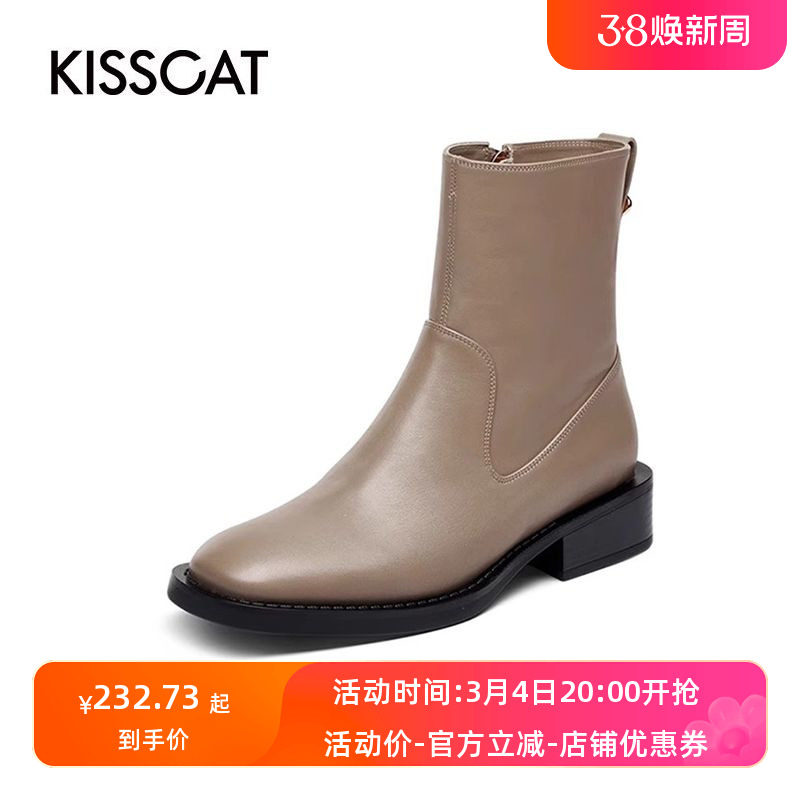 KISSCAT/接吻猫秋冬商场同款牛皮方头粗跟侧拉链短靴女KA10524-10