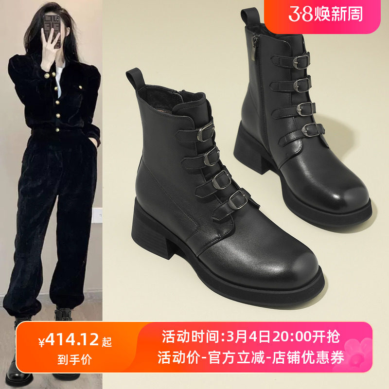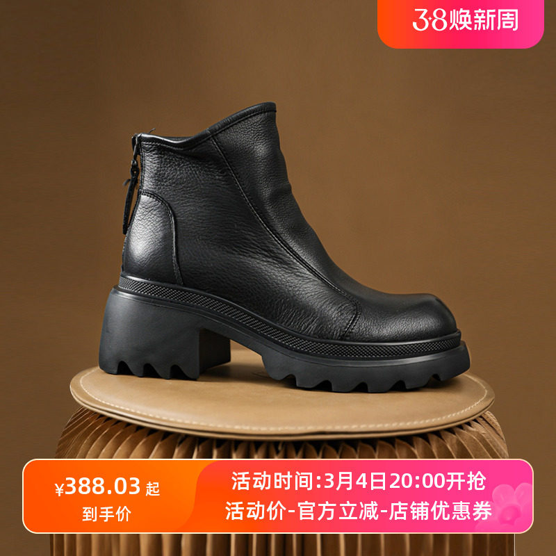 D:Fuse/迪芙斯冬季牛皮马丁靴厚底侧拉链圆头短靴女DF3411633F