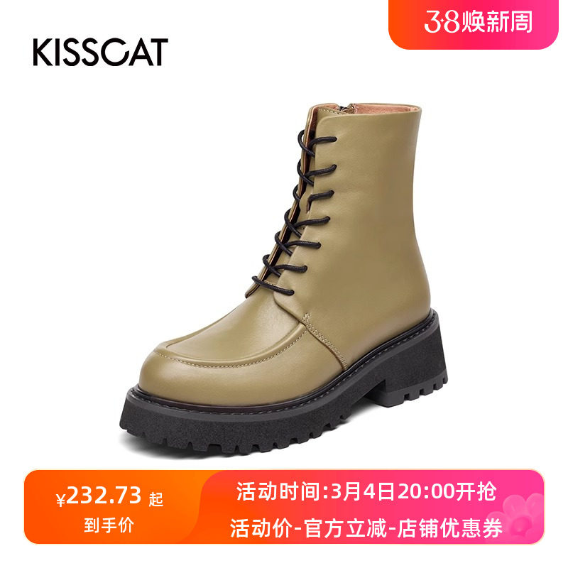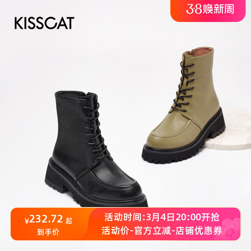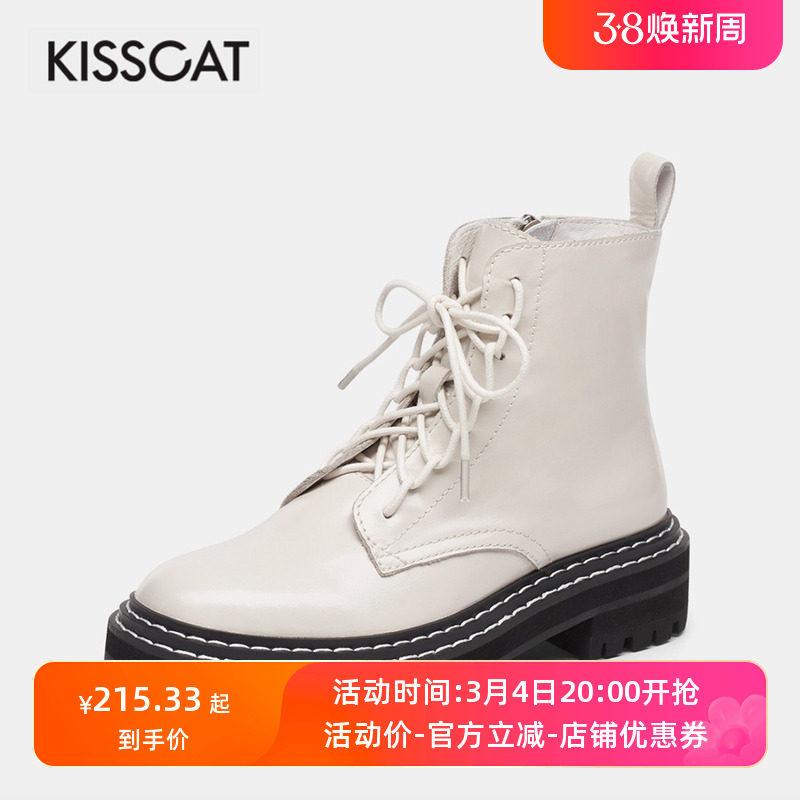 KISSCAT/接吻猫秋冬牛皮系带拉链厚底时尚短筒马丁靴女KA21541-50
