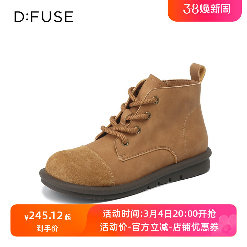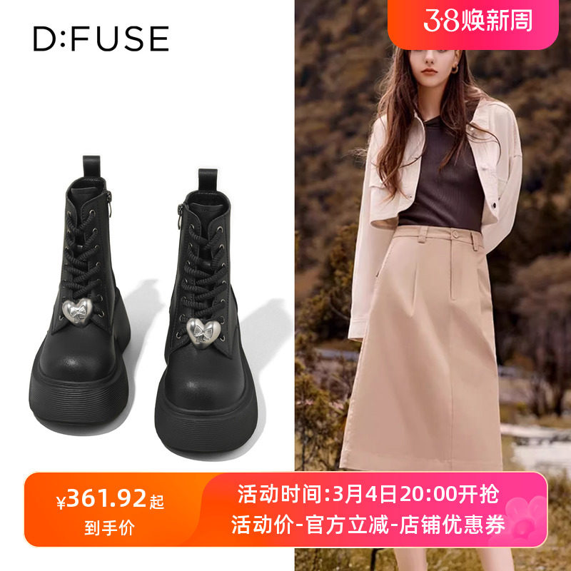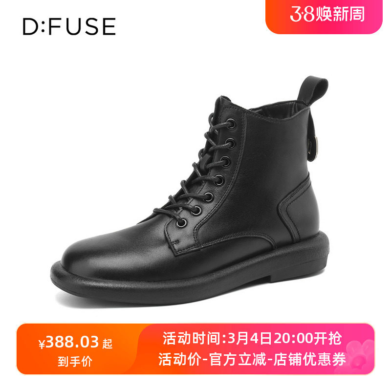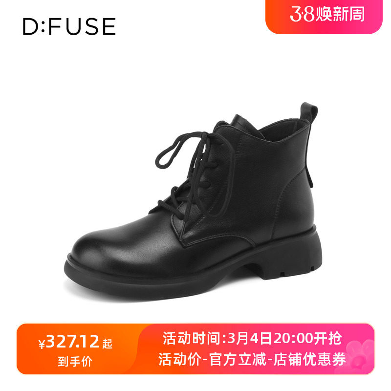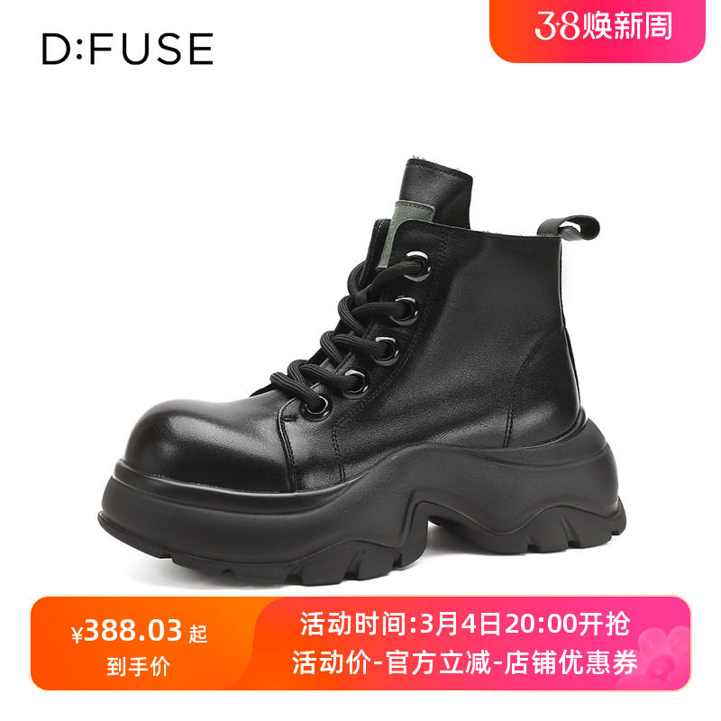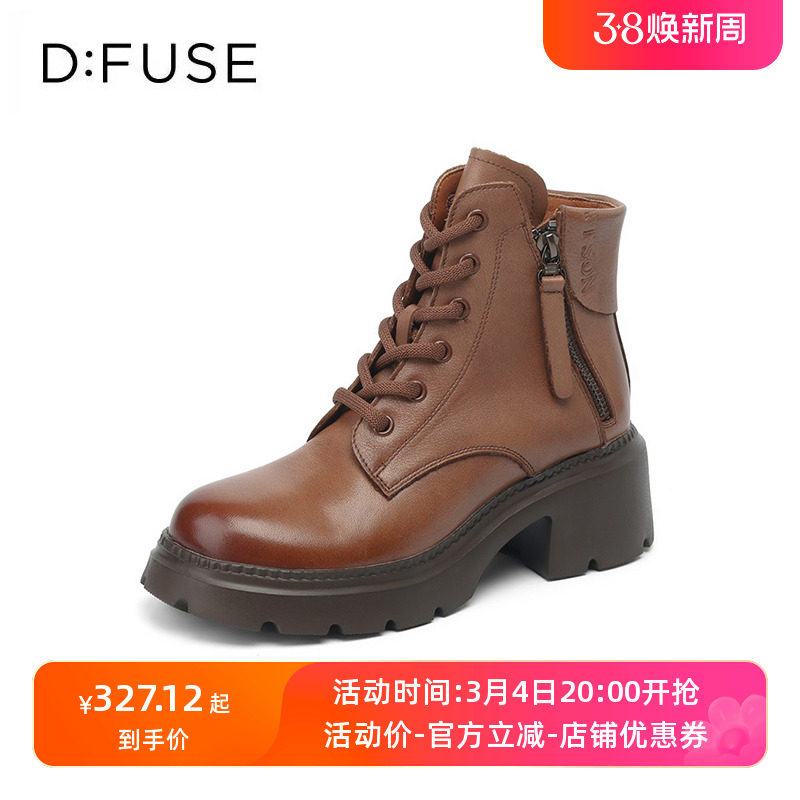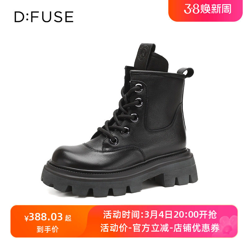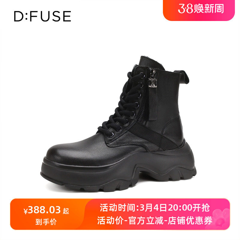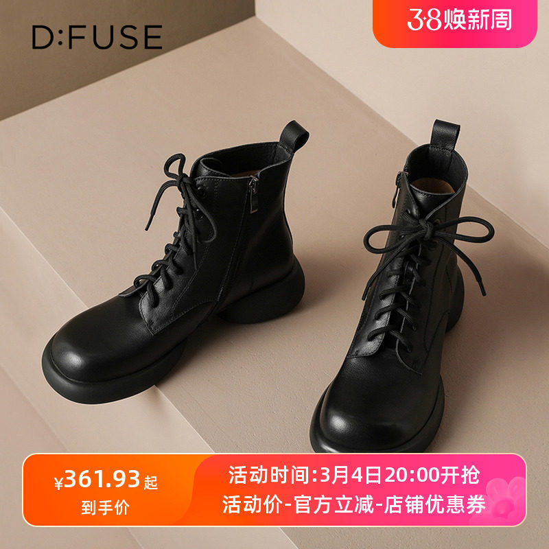 D:Fuse/迪芙斯春秋季圆头牛皮侧拉链系带厚底马丁靴女DF3311848F