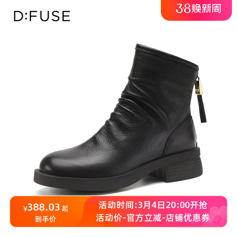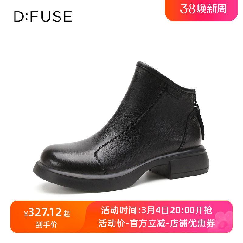 D:Fuse/迪芙斯冬季牛皮厚底圆头后拉链保暖加绒短靴女DF3311821F