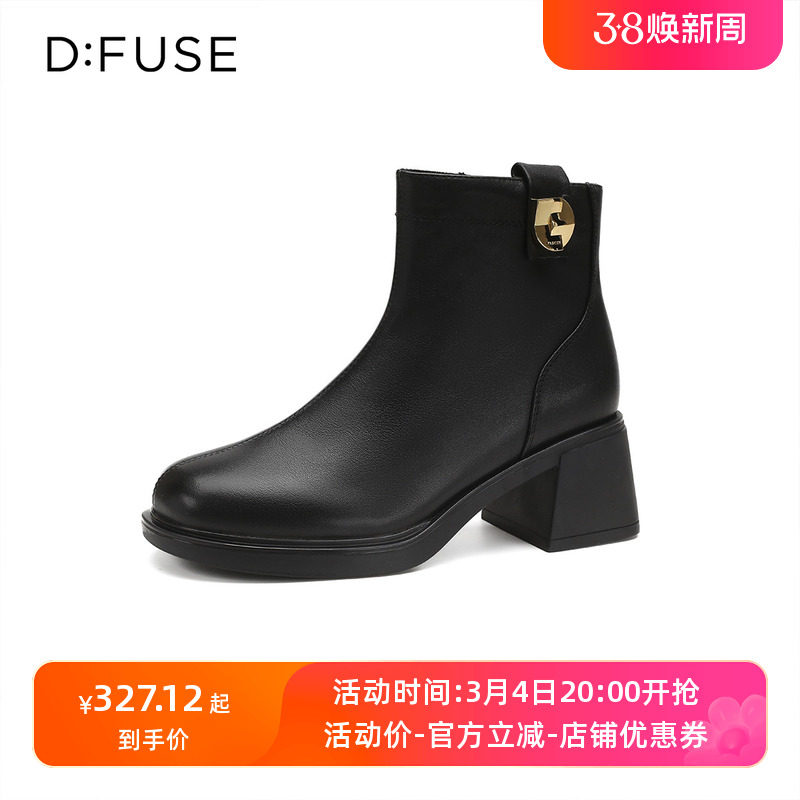 D:Fuse/迪芙斯冬季牛皮圆头马丁靴加绒保暖侧拉链高跟时装短靴女