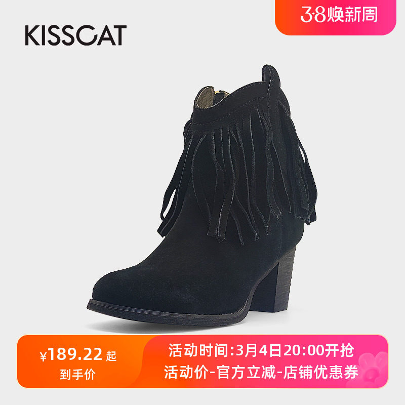 KISS CAT/接吻猫秋冬款牛反绒尖头侧拉链粗高跟短靴女KA76717-50