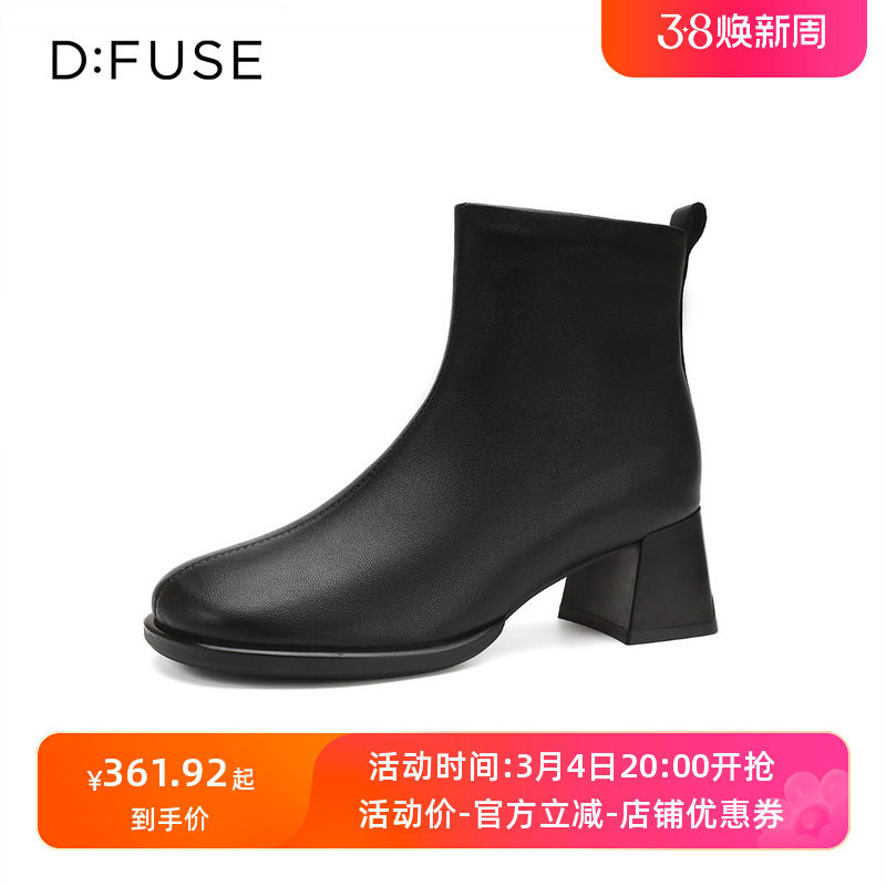 D:Fuse/迪芙斯冬季牛皮方头粗高跟侧拉链时装短靴女DF3311664E