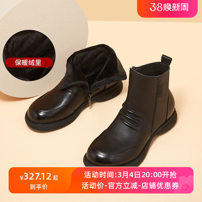 D:Fuse/迪芙斯冬季牛皮圆头厚底保暖加绒后拉链短靴女DF3311862F