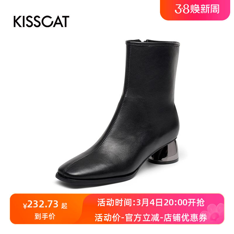 KISSCAT/接吻猫秋冬季牛皮方头异形跟侧拉链时装靴女KA10524-10