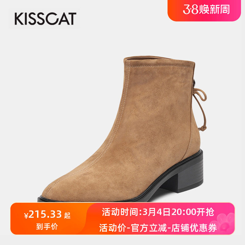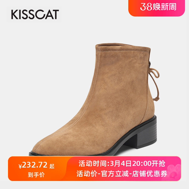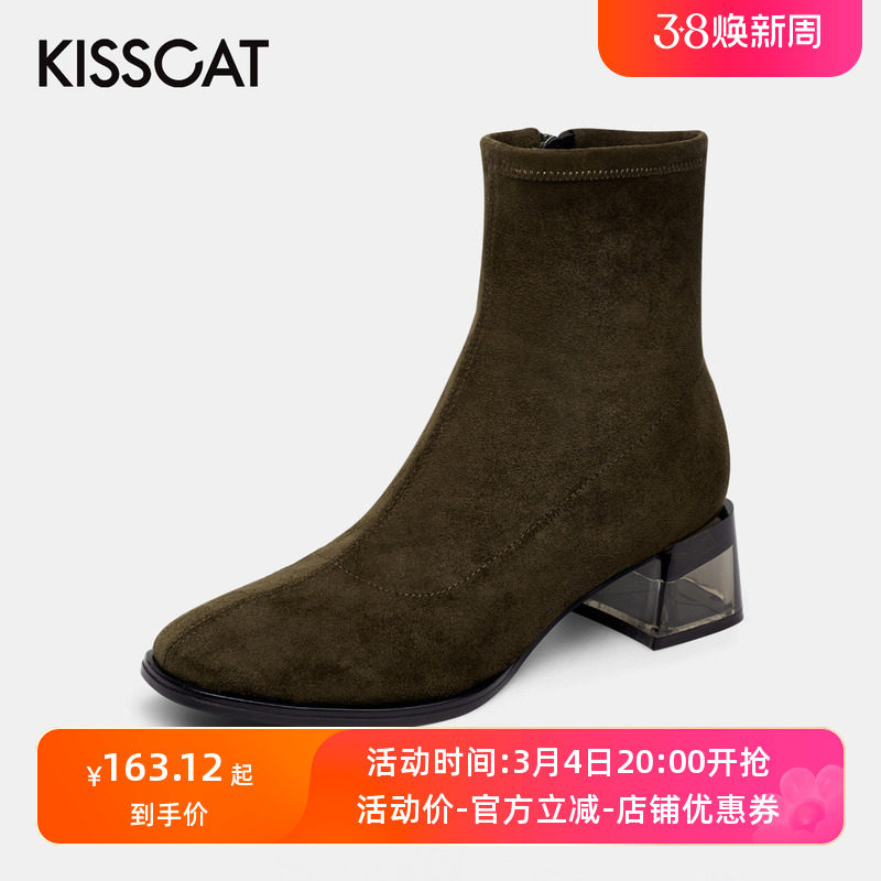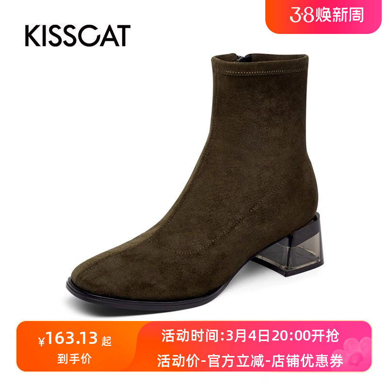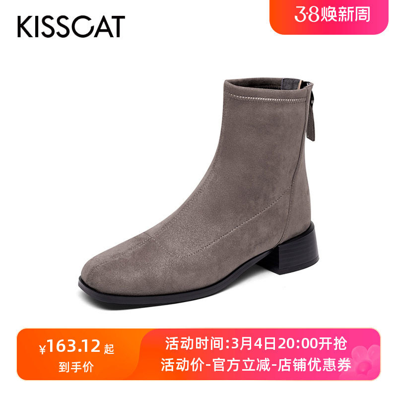 KISSCAT/接吻猫秋冬新款方头瘦瘦靴低跟侧拉链短靴女KA10711-10