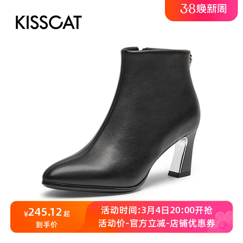 KISSCAT/接吻猫秋冬新品羊皮尖头侧拉链粗高跟短靴女KA32511-10
