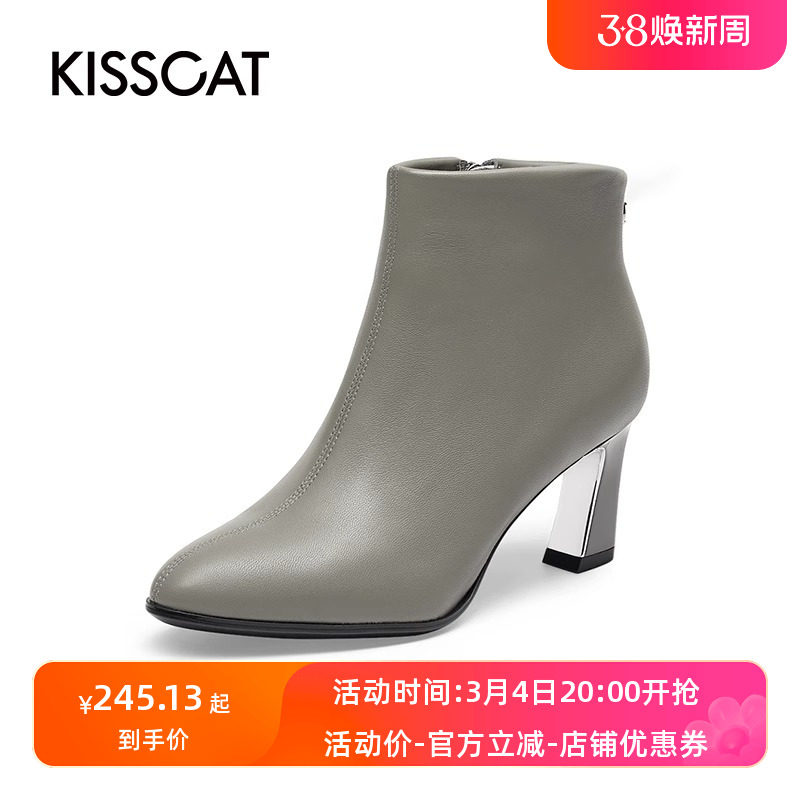 KISSCAT/接吻猫秋冬季尖头羊皮侧拉链高跟短筒时装靴女KA21536-11