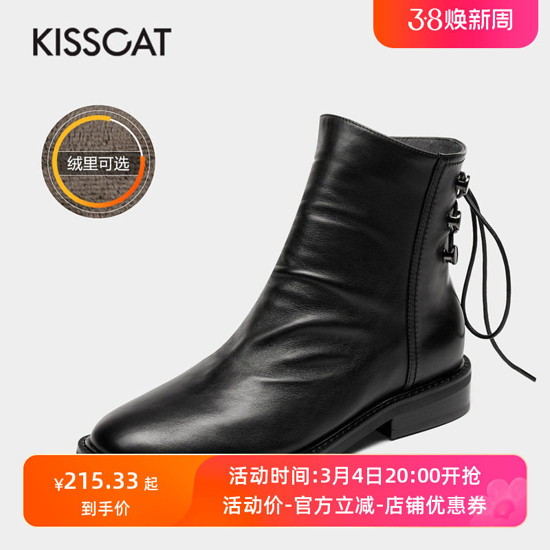 KISSCAT/接吻猫短靴秋冬季圆头平跟侧拉链牛皮马丁靴女KA10582-50