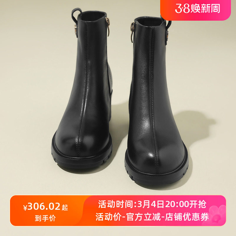 D:Fuse/迪芙斯冬季牛皮厚底保暖加绒侧拉链圆头短靴女DF3311865F