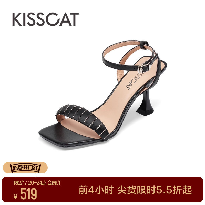 接吻猫夏季新款舒适精致细高跟鞋时尚方头超高跟一字带凉鞋女