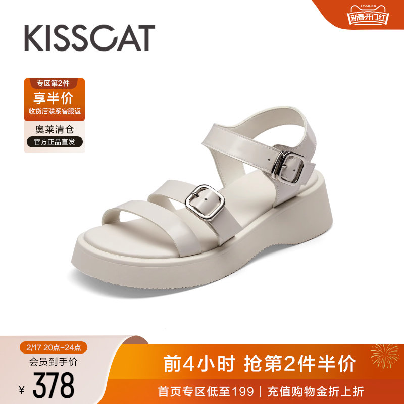 接吻猫新款潮流一字带时尚松糕鞋厚底运动休闲沙滩凉鞋女
