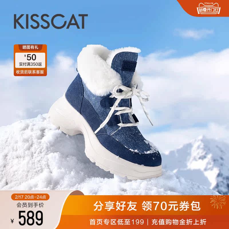 接吻猫棉鞋2023冬季新款休闲牛仔靴真皮冬靴运动厚底加绒雪地靴女