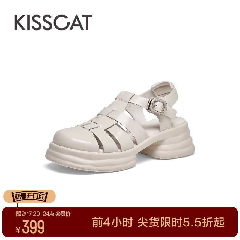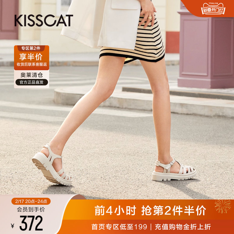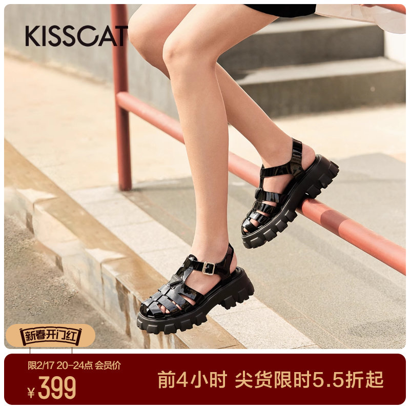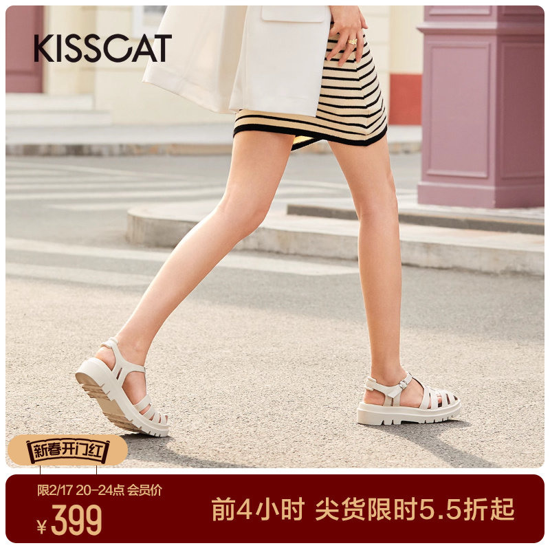 接吻猫夏新款复古潮流猪笼鞋圆头轻便厚底运动罗马凉鞋女