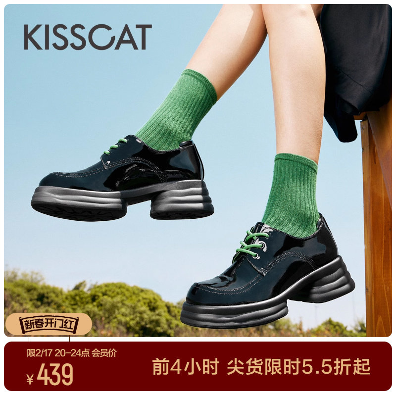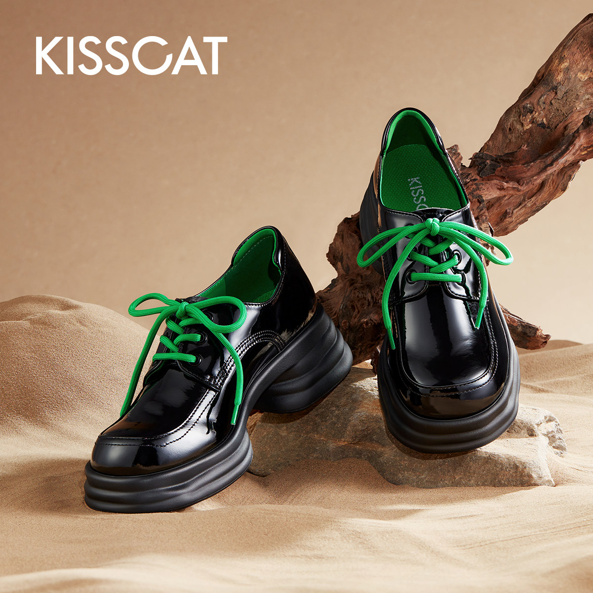接吻猫春夏新款休闲单鞋学院风运动撞色方头粗跟厚底牛皮乐福鞋女
