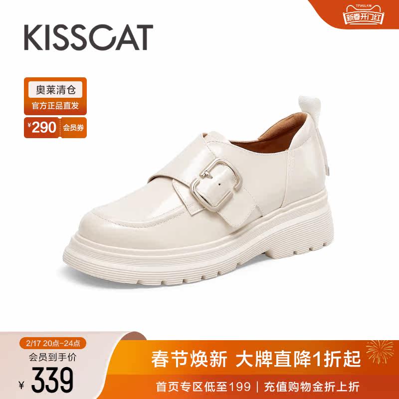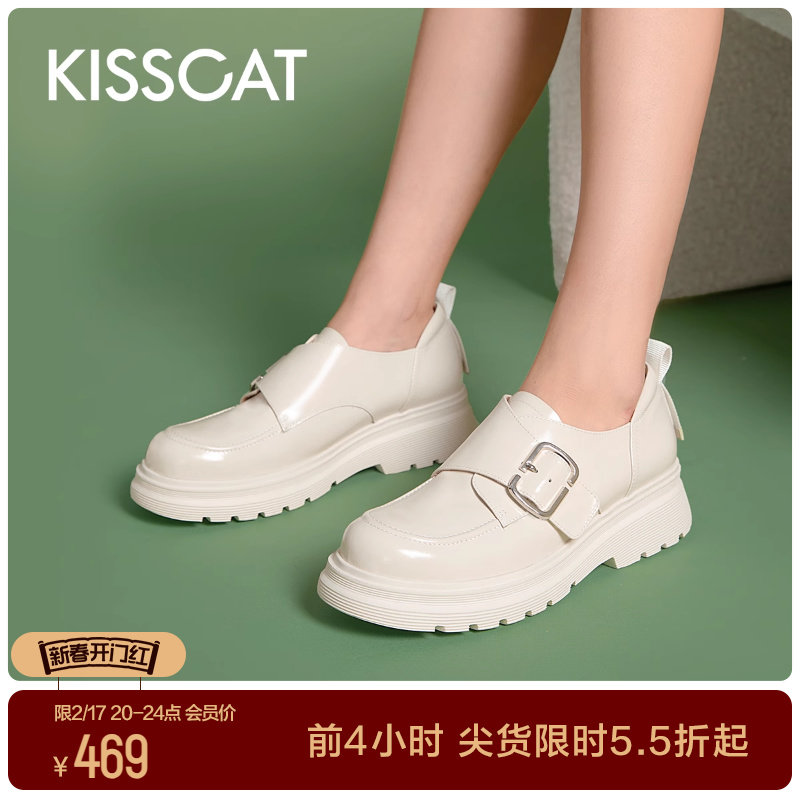 接吻猫秋季新款学院休闲魔术贴质感圆头粗跟乐福鞋KA32565-51