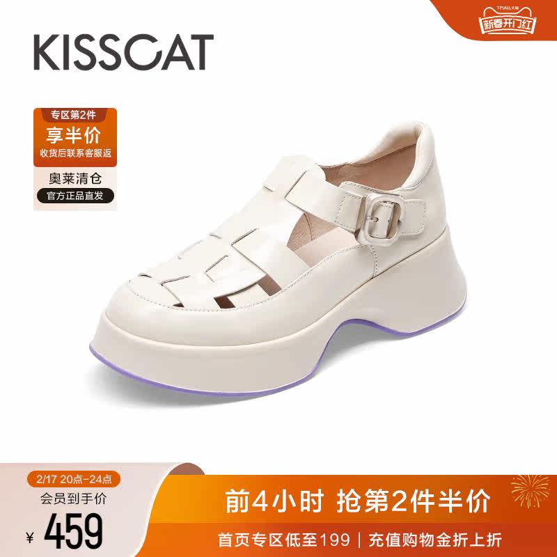 接吻猫夏季新款休闲镂空撞色猪笼鞋魔术贴圆头厚底罗马凉鞋女