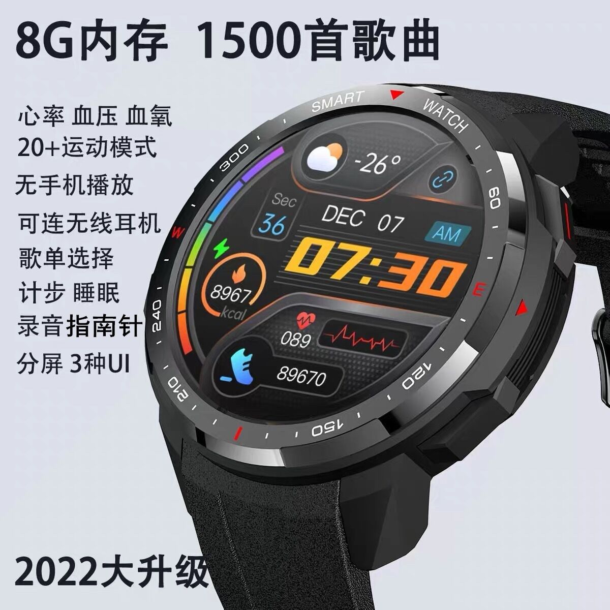 智能手表8G内存离线音乐通话户外运动录音心率血压指南针MP3手环
