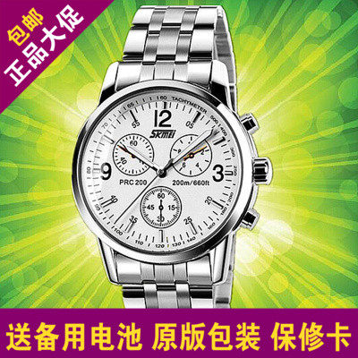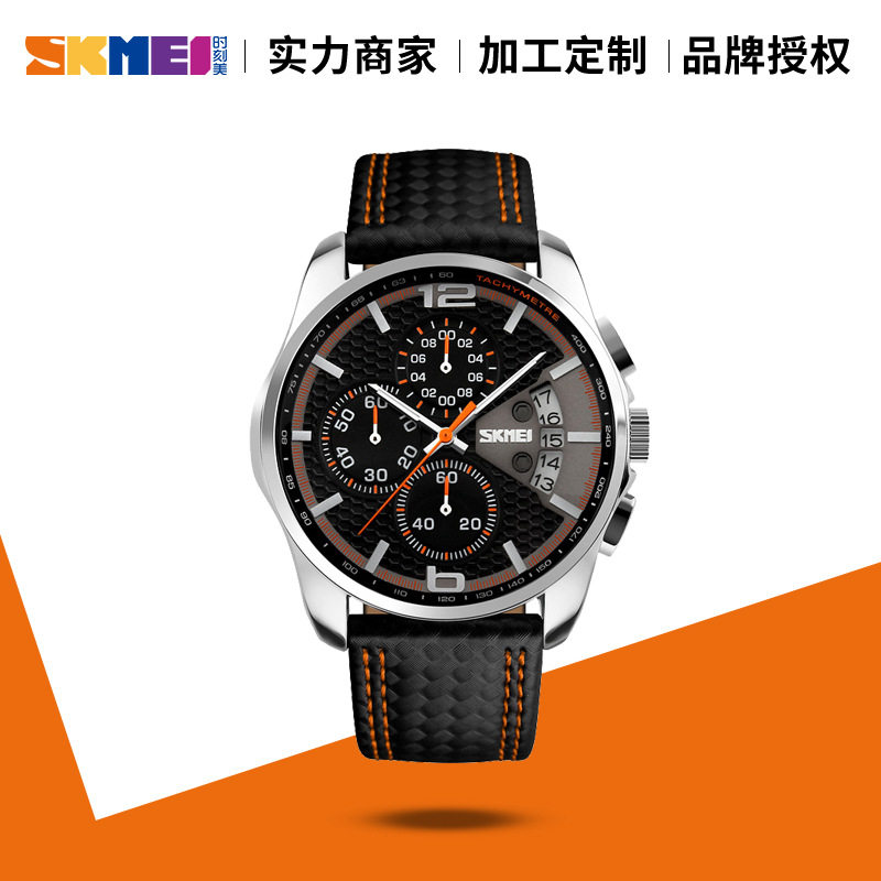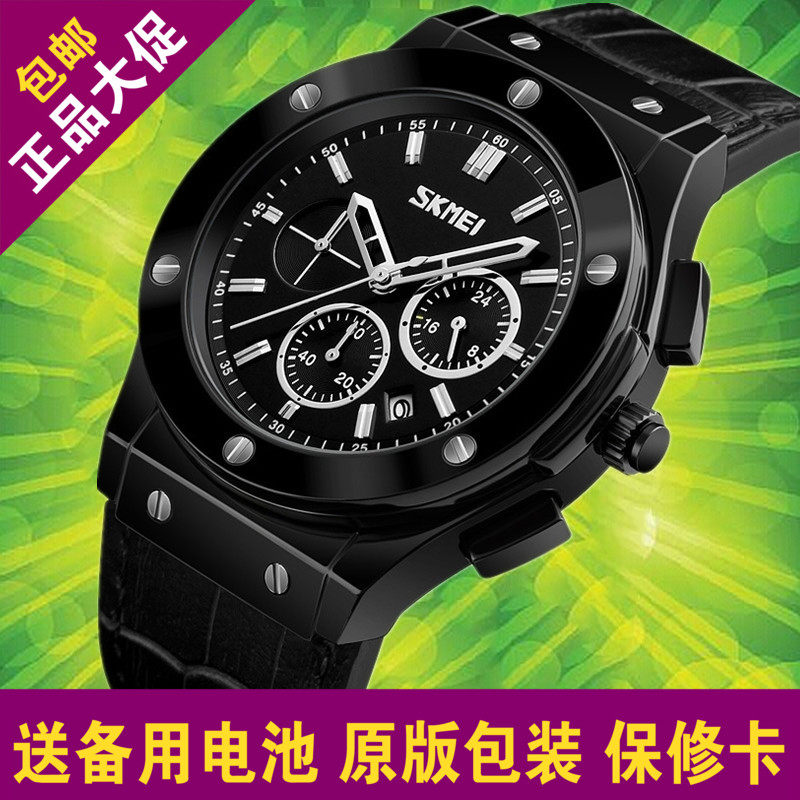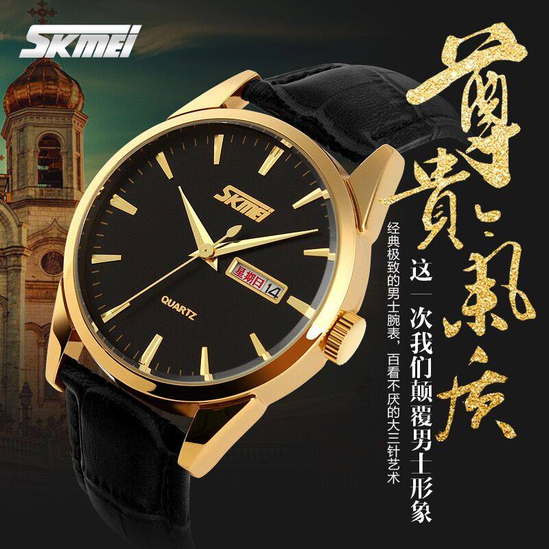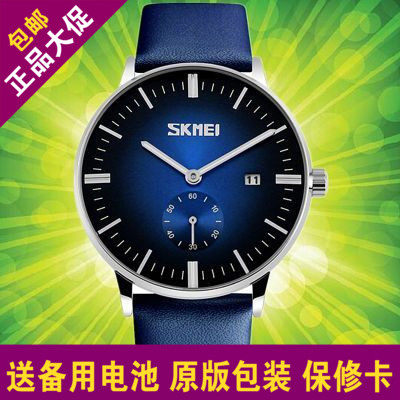 时刻美SKMEI男表男士手表学生日历防水真皮带手表腕表石英表时尚