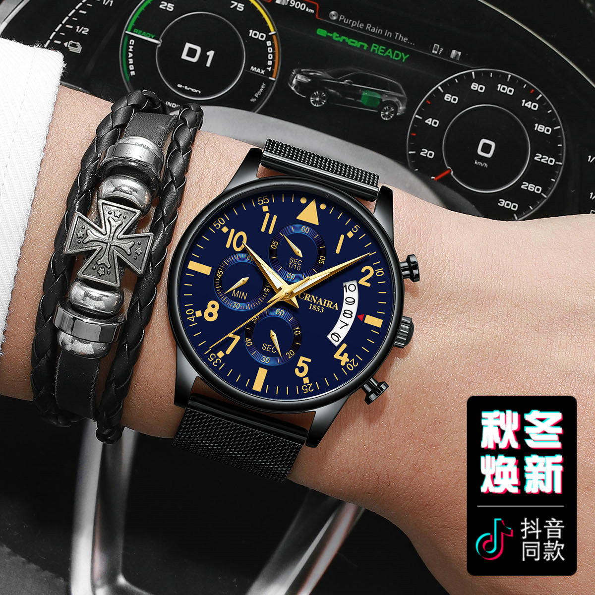 时刻美新款运动闹钟可分段计时电子表男潮流商务防水夜光真皮带表
