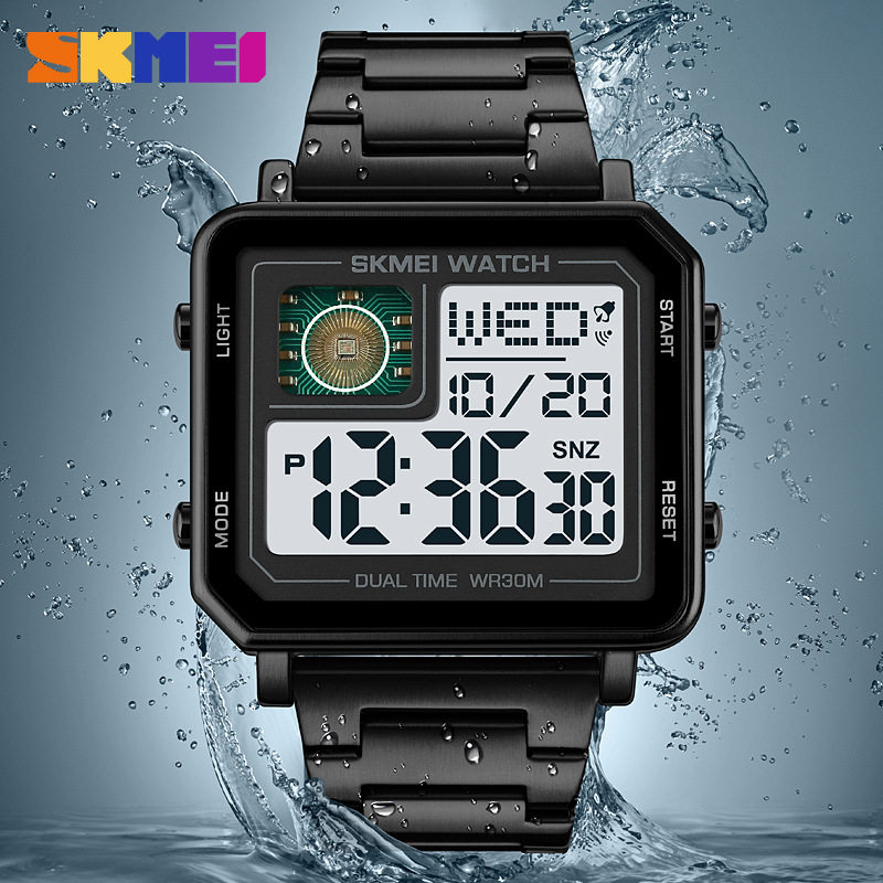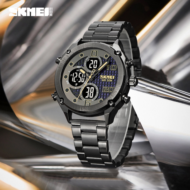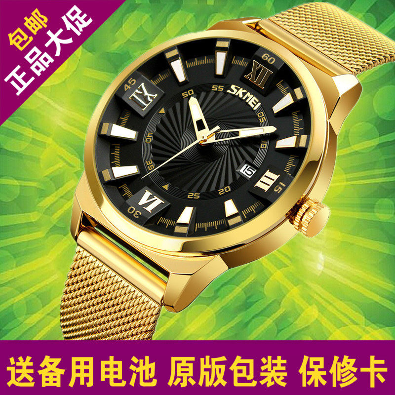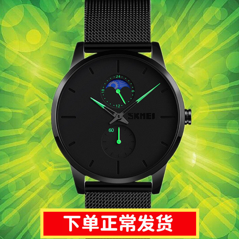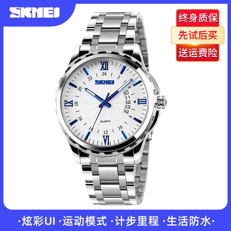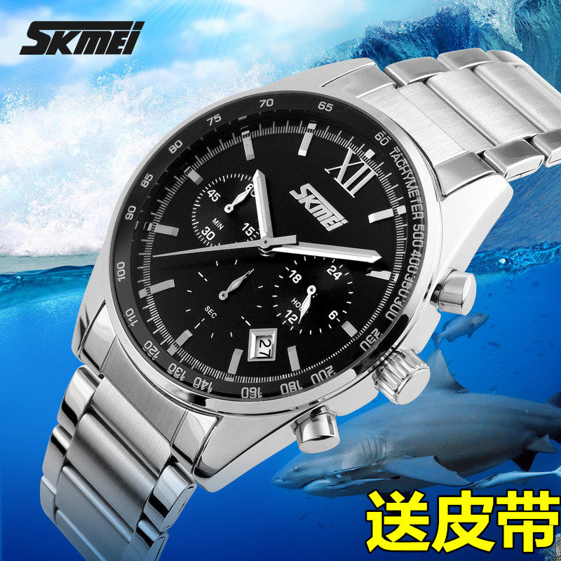 skmei手表多功能运动大表盘男学生石英表防水商务不锈钢网带腕表