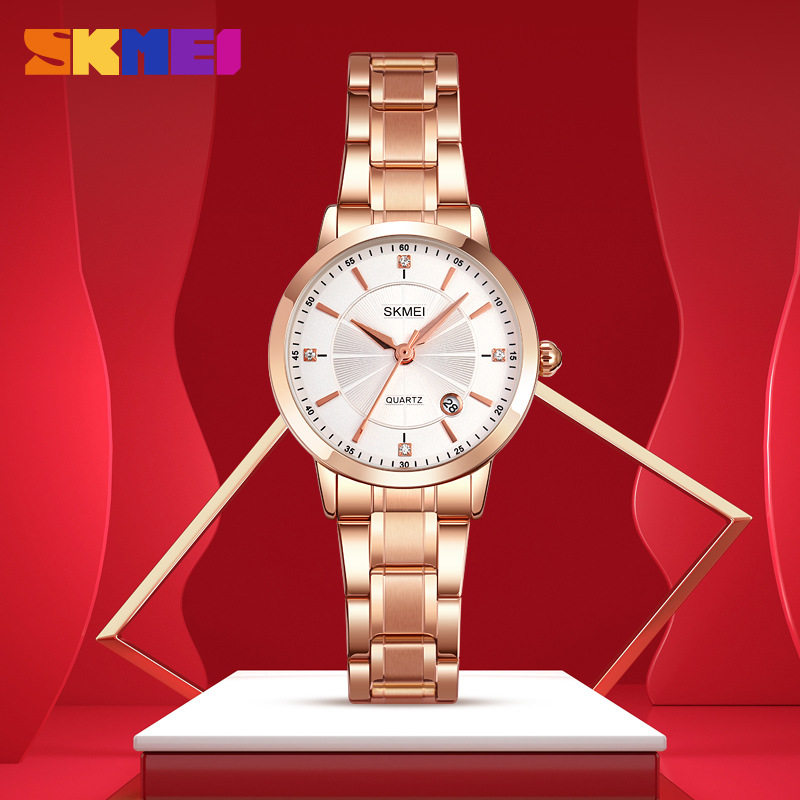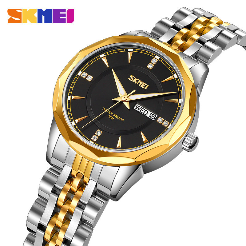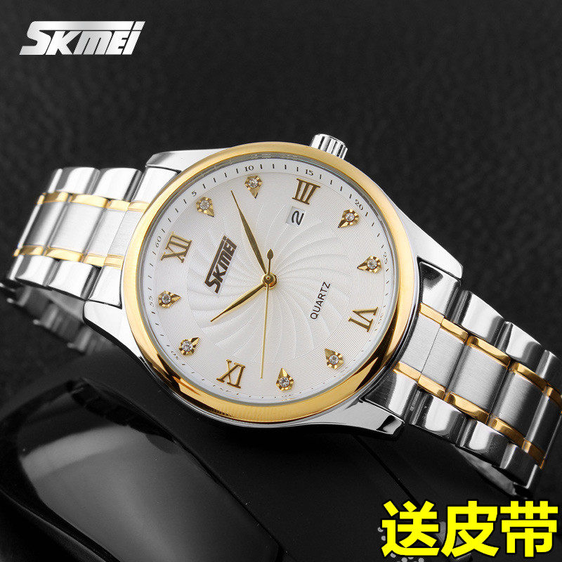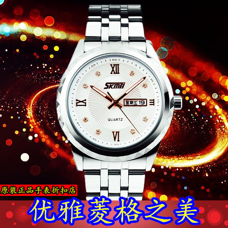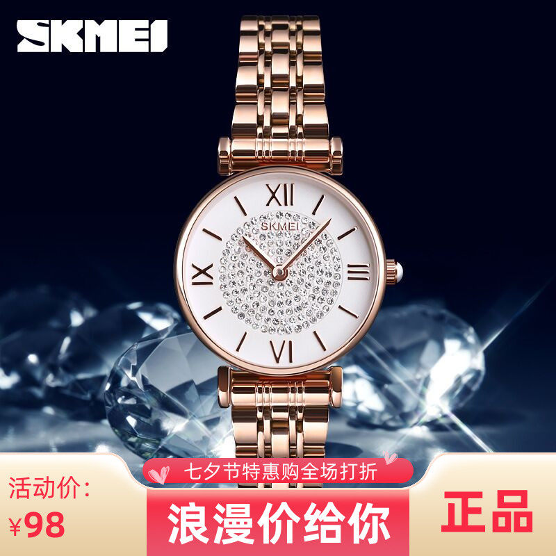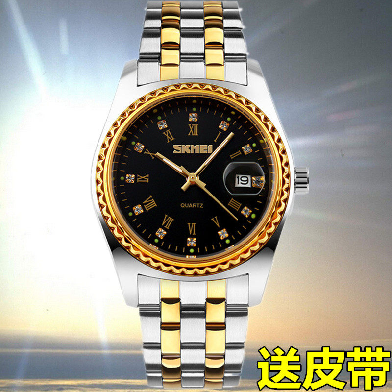 时刻美skmei手表男表钢带镶钻双日历商务休闲时尚石英表防水男士