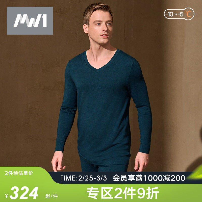 曼妮芬MW1男士冬季含羊绒保暖内衣舒适V领打底长袖长裤套装暖衣服