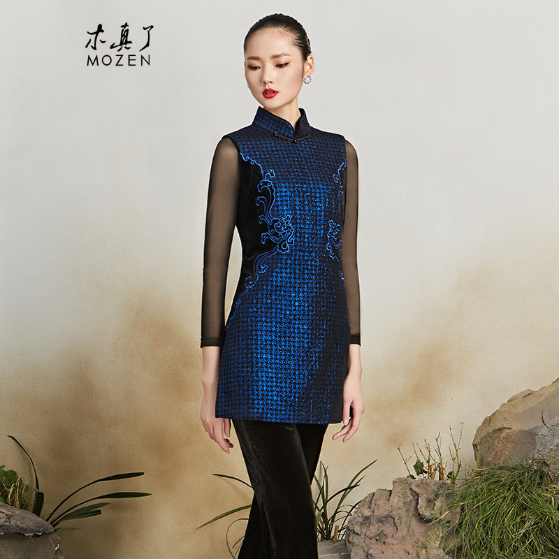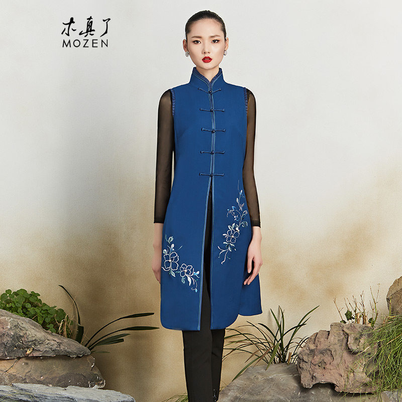木真了复古改良加棉保暖丝绒拼接刺绣修身马夹新品中长款马甲218