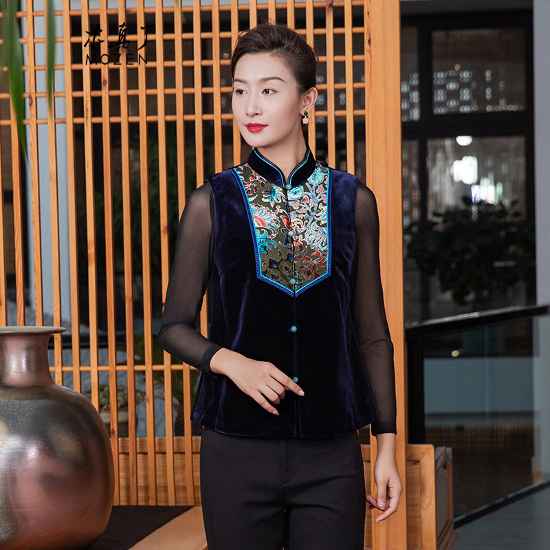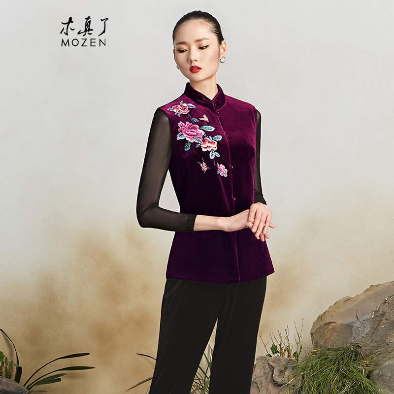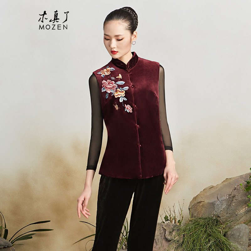 木真了中式丝绒唐装棉马甲女士秋冬新品复古刺绣保暖加棉马夹419