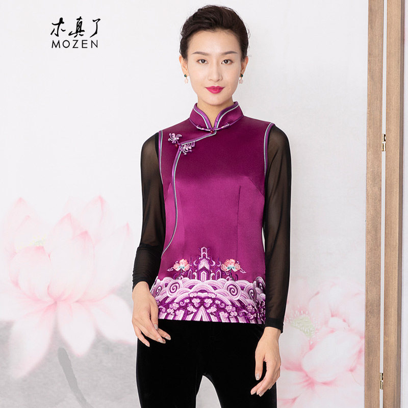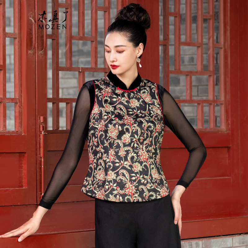 木真了唐装马夹立领女坎肩通勤新品气质上衣拼接印花保暖马甲112