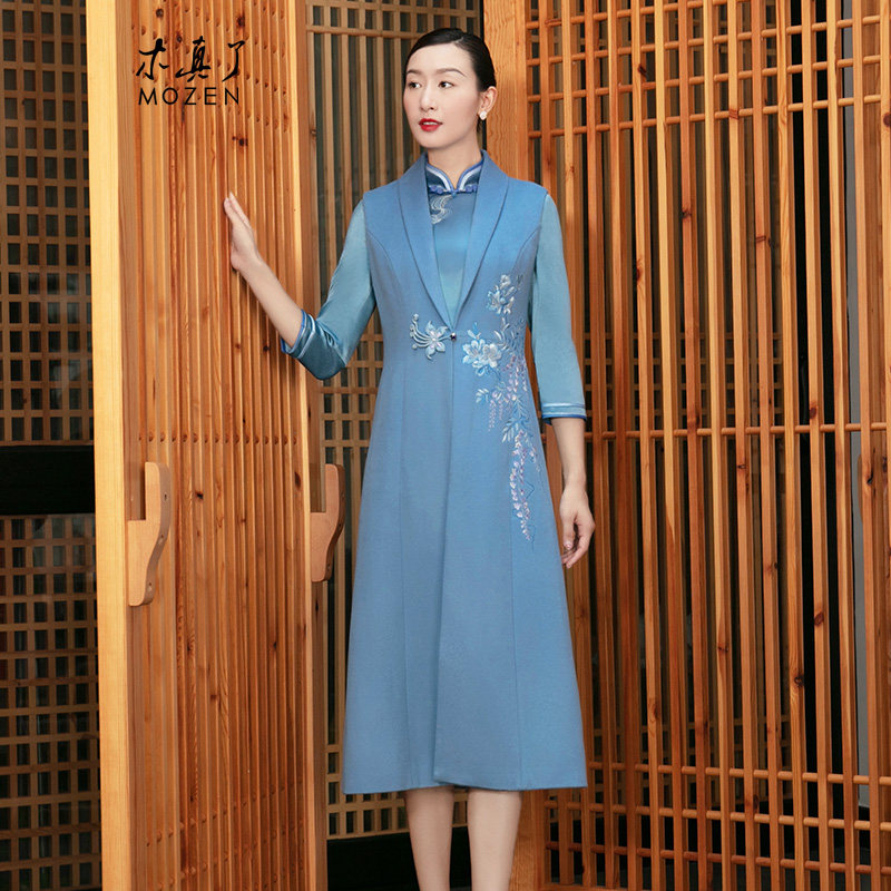 木真了唐装马甲冬中式长款毛呢马夹绣花羊毛无袖女外套修身型309