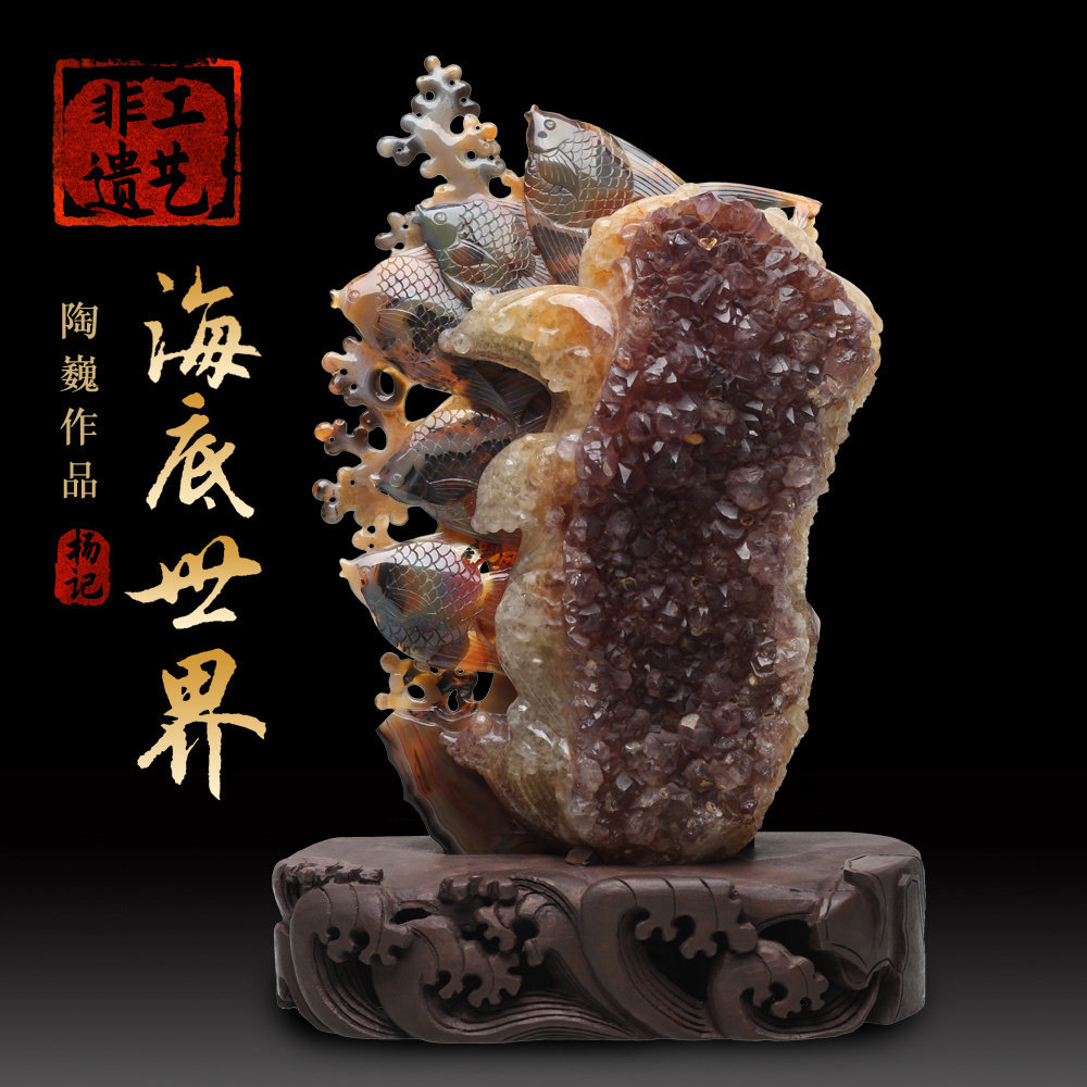 天然玛瑙摆件《海底世界》紫水晶雕刻工艺品高档客厅创意饰品