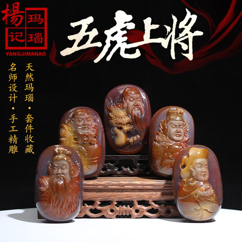 天然玛瑙雕刻手把件《五虎上将》玉雕套件俏色大师设计关公收藏