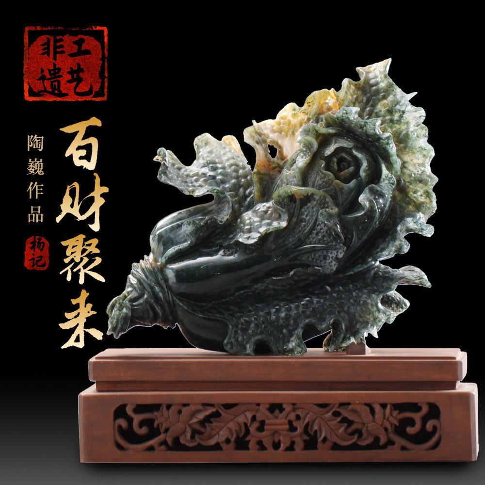 阜新本地天然水草玛瑙摆件《百财聚来》绿水草白菜客厅玄关装饰品