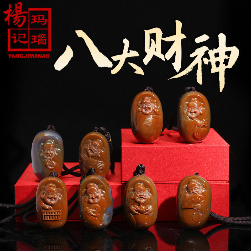天然玛瑙手把件同料雕刻《八大财神》财神爷八方来财大师收藏作品