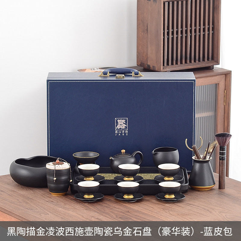 松发瓷器功夫茶具套装家用渐变黑陶轻奢高档礼盒茶盘茶壶套装送礼