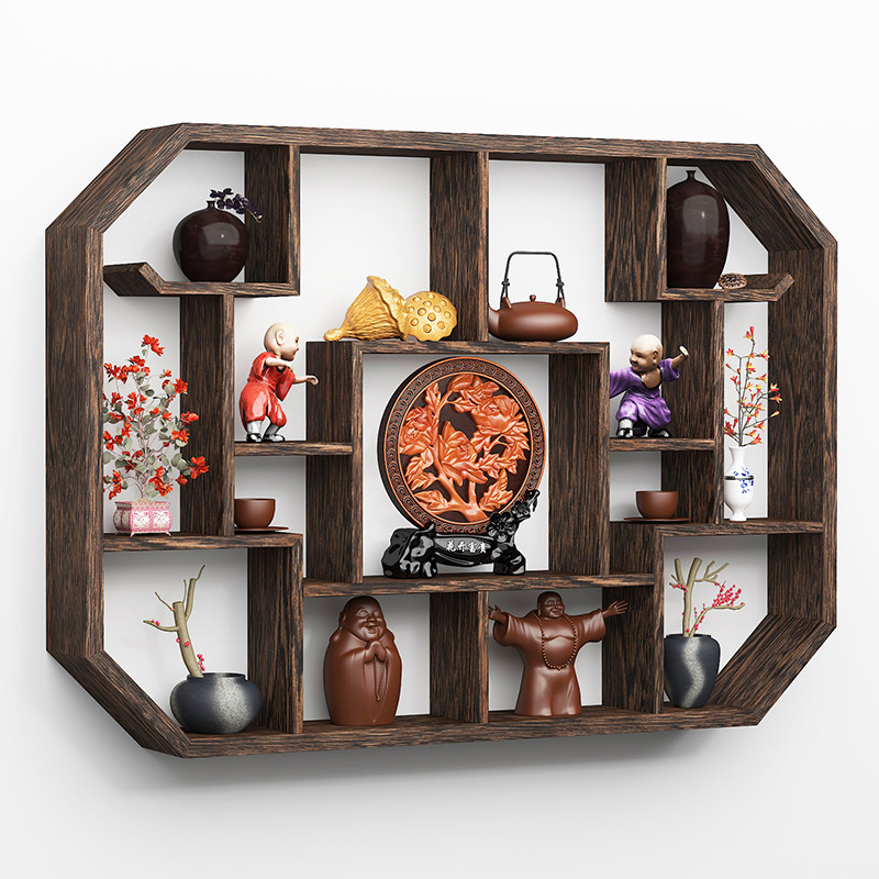 博古架实木新中式壁挂式上墙茶壶展示架置物架简约现代摆件收纳架