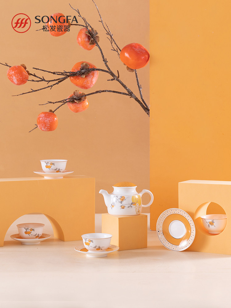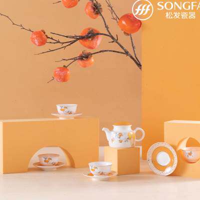 松发瓷器9头遇见好柿功夫茶具套装骨瓷茶壶茶杯礼盒套装中秋送礼