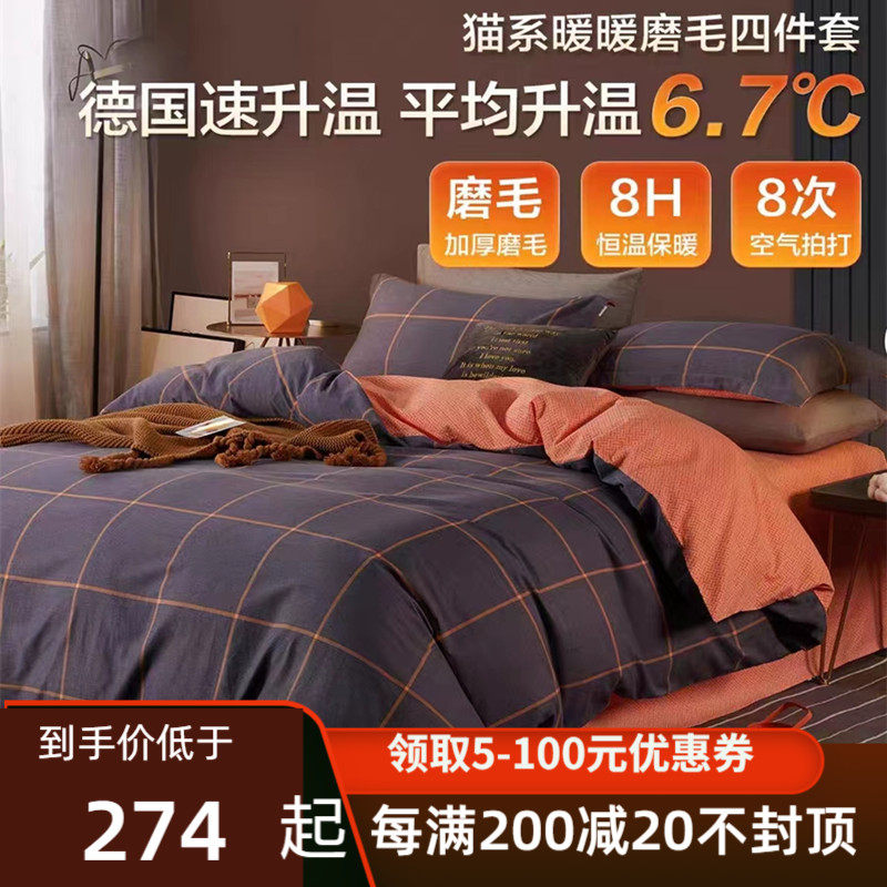 博洋家纺磨毛四件套全棉纯棉被罩加厚床上用品床单被套冬季三件套