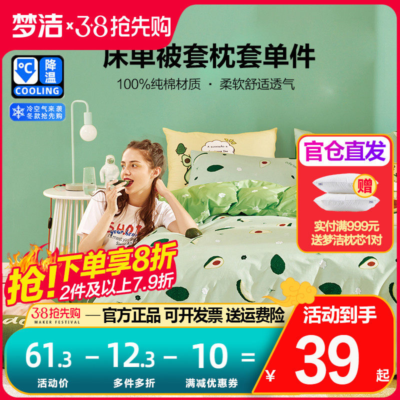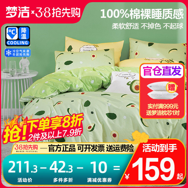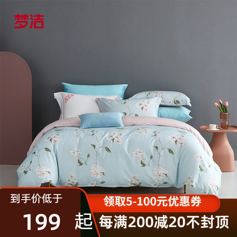 梦洁家纺四件套纯棉100全棉被套床单小清新田园风床上用品泽西岛