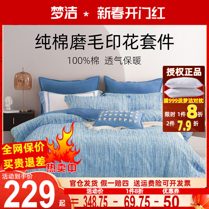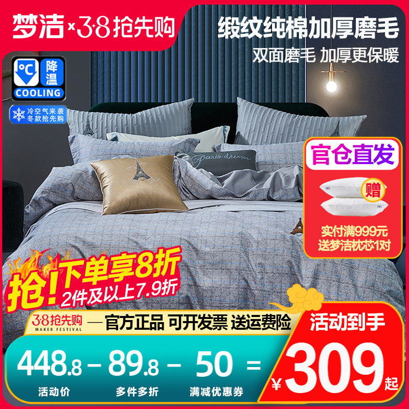 梦洁加厚磨毛四件套全棉纯棉被套248x248高端床单梦洁家纺欣动1.8